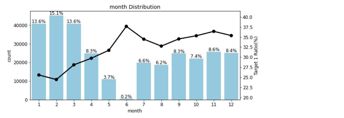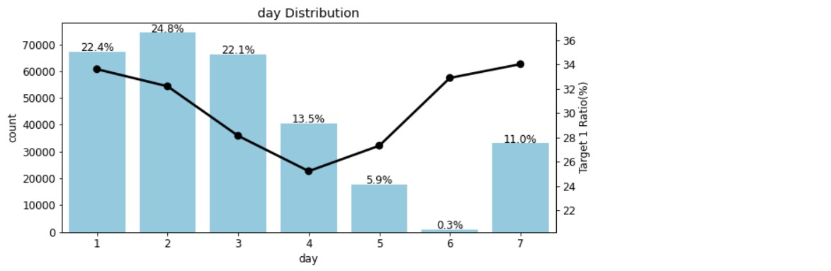 day 피처를 보면 1에서 4로 갈수록 타깃값 1 비율이 줄어들고, 4에서 7로 갈수록 비율이 늘어난다. month 피처는 day 피처와는 반대되는 것을 알 수 있다.
