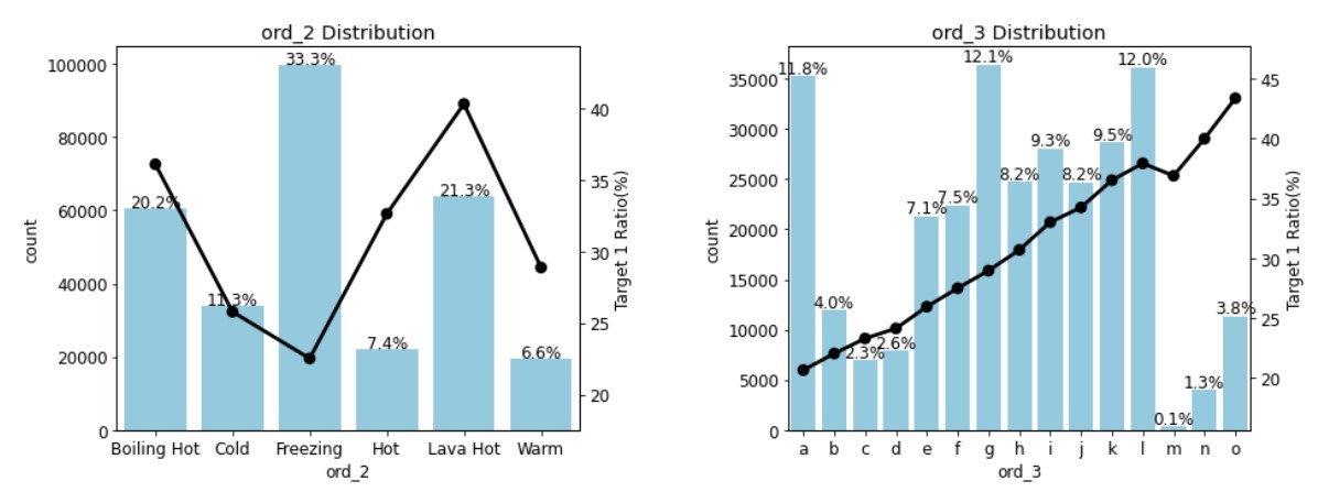 ord_5는 고윳값 개수가 너무 많아 x축 라벨이 겹쳐졌지만, ord_4와 ord_5 둘 다 고윳값 순서에 따라 타깃값 1 비율이 증가한다는 건 알아볼 수 있다.