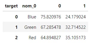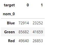 판다스의 crosstab() 함수로 nom_0과 타깃값(target) 간 교차분석표를 만들어보자.pd.crosstab(train['nom_0'],train['target'])