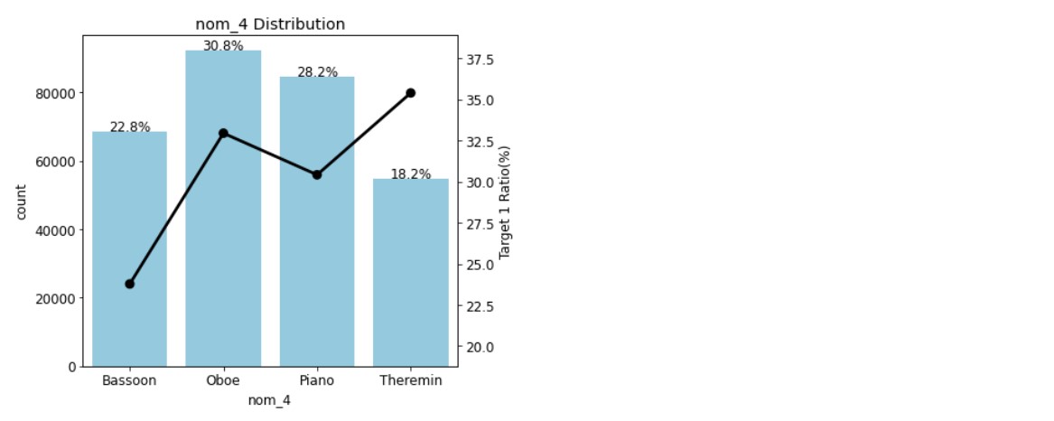 결과 그래프가 잘 나타났다! 이 그림에서 카운트플롯은 피처별 고윳값의 비율을 나타내고, 꺾은 선 그래프는 포인트플롯으로 해당 고윳값 중 타깃값 1의 비율을 나타낸다. 예를 들어 5번째 그래프를 보면, 고윳값 Piano의 비율은 28.2%고 그중 타깃값이 1인 데이터는 30% 정도인 걸 알 수 있다. 자연스럽게 타깃값이 0인 데이터는 70% 정도인 걸 알 수 있다.