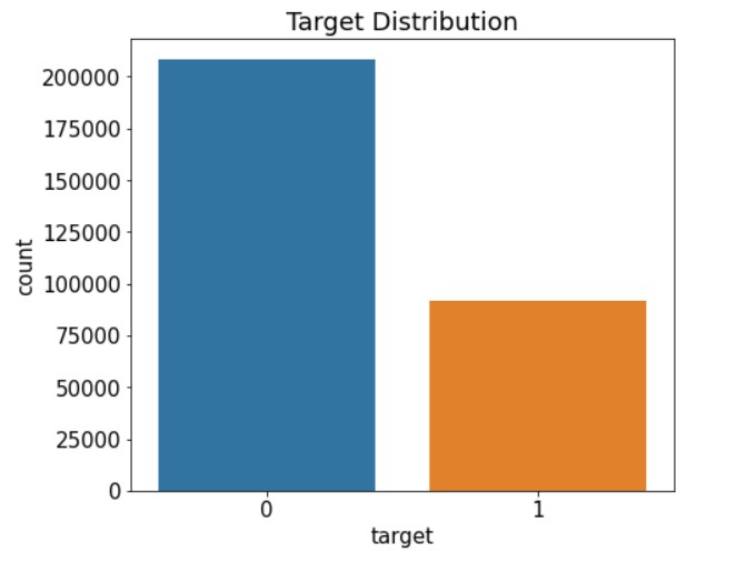 mpl.rc('font', size=15) #폰트 크기 설정 plt.figure(figsize=(7,6)) #Figure 크기 설정 #타깃값 분포 카운트플롯 ax=sns.countplot(x='target', data=train) ax.set_title('Target Distribution');countplot()의 x 파라미터에 타깃값('target')을 전달했고, data 파라미터에 훈련 데이터(train)를 전달했다. 그러면 train['target']에서 고윳값별로 데이터가 몇 개인지 카운트플롯으로 그려준다.