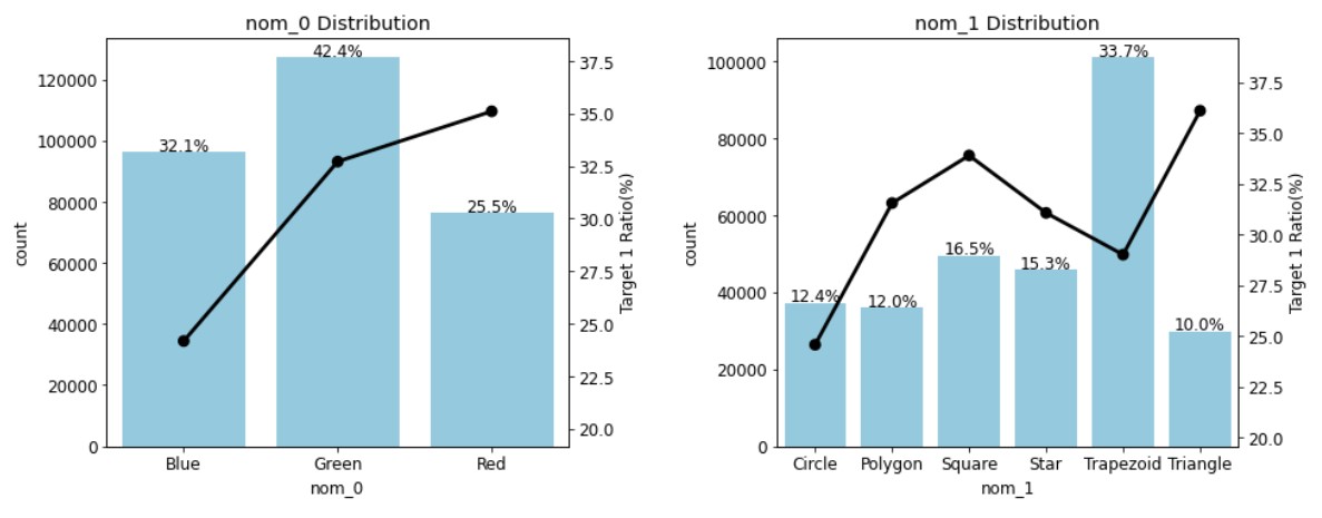 이번엔 명목형 피처 분포와 명목형 피처별 타깃값 1의 비율을 살펴보자! 이전 글에서 피처 요약표를 만들었을 때 nom_5~9는 고윳값 개수가 많고 의미를 알 수 없는 값이 입력돼 있었기 때문에, 여기서는 nom_0~4까지만 시각화할 것이다.