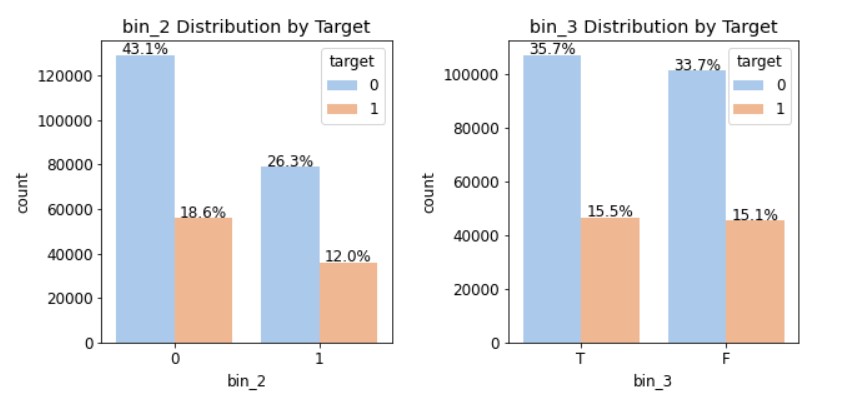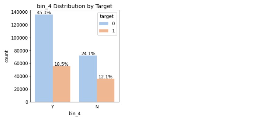 피처별로 총 5개의 그래프가 출력될 것이기 때문에, 여러 그래프를 격자 형태로 배치하는 GridSpec을 사용해서 그려보자!import matplotlib.gridspec as gridspec #여러 그래프를 격자 형태로 배치 ⓐ #3행 2열 틀(Figure) 준비 mpl.rc('font',size=12) grid=gridspec.GridSpec(3,2) #그래프(서브플롯)를 3행 2열로 배치 plt.figure(figsize=(10,16)) #전체 Figure 크기 설정 plt.subplots_adjust(wspace=0.4, hspace=0.3) #서브플롯 간 좌우/상하 여백 설정 ⓑ #서브플롯 그리기 bin_features=['bin_0','bin_1','bin_2','bin_3','bin_4'] #피처 목록 ⓒ for idx, feature in enumerate(bin_features): # ⓓ ax=plt.subplot(grid[idx]) # ⓔ #ax축에 타깃값 분포 카운트플롯 그리기 ⓕ sns.countplot(x=feature, data=train, hue='target', palette='pastel', #그래프 색상 설정 ax=ax) ax.set_title(f'{feature} Distribution by Target') #그래프 제목 설정 ⓖ write_percent(ax, len(train)) #비율 표시 ⓗⓐ 서브플롯을 3행 2열로 배치한 GridSpec 객체를 grid 변수에 할당한다. 나중에 grid[0], grid[1],... 과 같이 원하는 서브플롯을 지정할 수 있다.