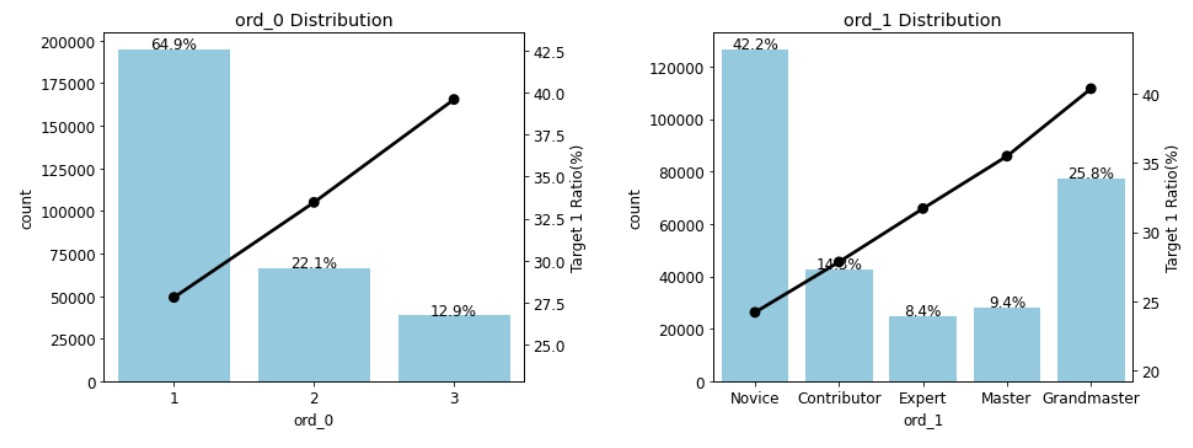 from pandas.api.types import CategoricalDtype ord_1_value=['Novice','Contributor','Expert','Master','Grandmaster'] ord_2_value=['Freezing','Cold','Warm','Hot','Boiling Hot','Lava Hot'] #순서를 지정한 범주형 데이터 타입 ord_1_dtype=CategoricalDtype(categories=ord_1_value, ordered=True) ord_2_dtype=CategoricalDtype(categories=ord_2_value, ordered=True) #데이터 타입 변경 train['ord_1']=train['ord_1'].astype(ord_1_dtype) train['ord_2']=train['ord_2'].astype(ord_2_dtype)plot_cat_dist_with_true_ratio(train, ord_features, num_rows=2, num_cols=2, size=(15,12))