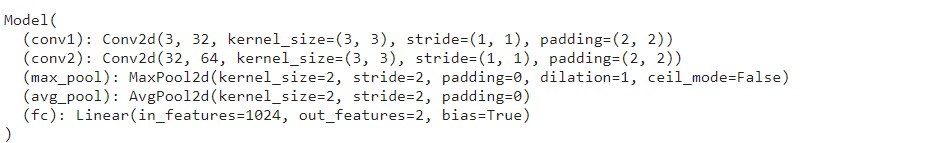 class Model(nn.Module): # 신경망 계층 정의 def __init__(self): super().__init__() # 상속받은 nn.Module의 __init__() 메서드 호출 # 첫 번째 합성곱 계층 self.conv1 = nn.Conv2d(in_channels=3, out_channels=32, kernel_size=3, padding=2) # 두 번째 합성곱 계층 self.conv2 = nn.Conv2d(in_channels=32, out_channels=64, kernel_size=3, padding=2) # 최대 풀링 계층 self.max_pool = nn.MaxPool2d(kernel_size=2) # 평균 풀링 계층 self.avg_pool = nn.AvgPool2d(kernel_size=2) # 전결합 계층 self.fc = nn.Linear(in_features=64 * 4 * 4, out_features=2) # 순전파 출력 정의 def forward(self, x): x = self.max_pool(F.relu(self.conv1(x))) x = self.max_pool(F.relu(self.conv2(x))) x = self.avg_pool(x) x = x.view(-1, 64 * 4 * 4) # 평탄화 x = self.fc(x) return x마지막으로, 이렇게 정의한 Model 클래스로 CNN 모델을 생성하여 device 장비에 할당하겠습니다. 현재 device는 GPU를 사용하도록 설정되어 있습니다.