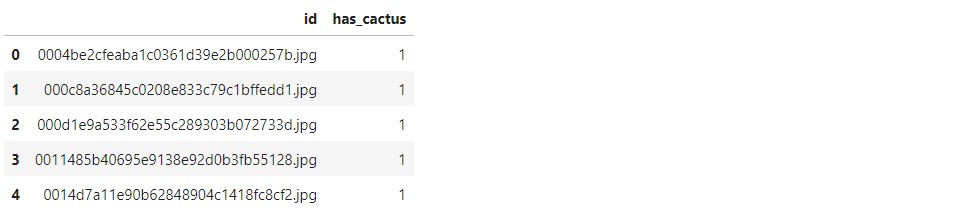 import pandas as pd # 데이터 경로 data_path = '/kaggle/input/aerial-cactus-identification/' labels = pd.read_csv(data_path + 'train.csv') submission = pd.read_csv(data_path + 'sample_submission.csv')labels.head()