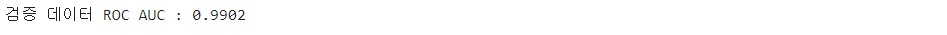 model.eval() # 모델을 평가 상태로 설정 with torch.no_grad(): # 기울기 계산 비활성화 for images, labels in loader_valid: # 이미지, 레이블 데이터 미니배치를 장비에 할당 images = images.to(device) labels = labels.to(device) # 순전파 : 이미지 데이터를 신경망 모델의 입력값으로 사용해 출력값 계산 outputs = model(images) preds = torch.softmax(outputs.cpu(), dim=1)[:, 1] # 예측 확률 true = labels.cpu() # 실제값 # 예측 확률과 실제값을 리스트에 추가 preds_list.extend(preds) true_list.extend(true) # 검증 데이터 ROC AUC 점수 계산 print(f'검증 데이터 ROC AUC : {roc_auc_score(true_list, preds_list):.4f}')
