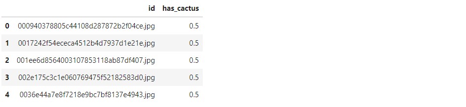 id는 테스트 데이터의 이미지 파일이고, 제출용 샘플이라 현재의 타깃값(has_cactus)은 의미가 없습니다. 나중에 테스트 이미지 데이터에 선인장이 있을 확률을 예측해서 타깃값을 갱신해 주면 됩니다.
