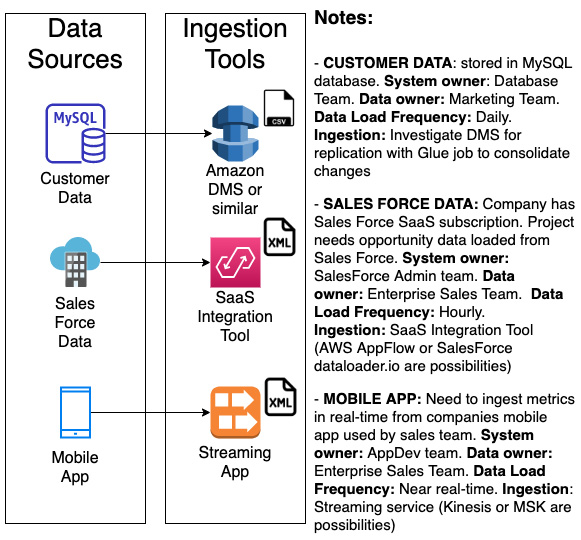 이러한 데이터 소스에 대해 데이터 엔지니어가 수집해야 하는 정보에는 아래와 같은 것들이 있습니다.- 데이터가 포함된 소스 시스템에 대한 세부 정보(데이터베이스의 데이터, 서버의 파일, Amazon S3의 기존 파일, 스트리밍 소스에서 오는 데이터 등)