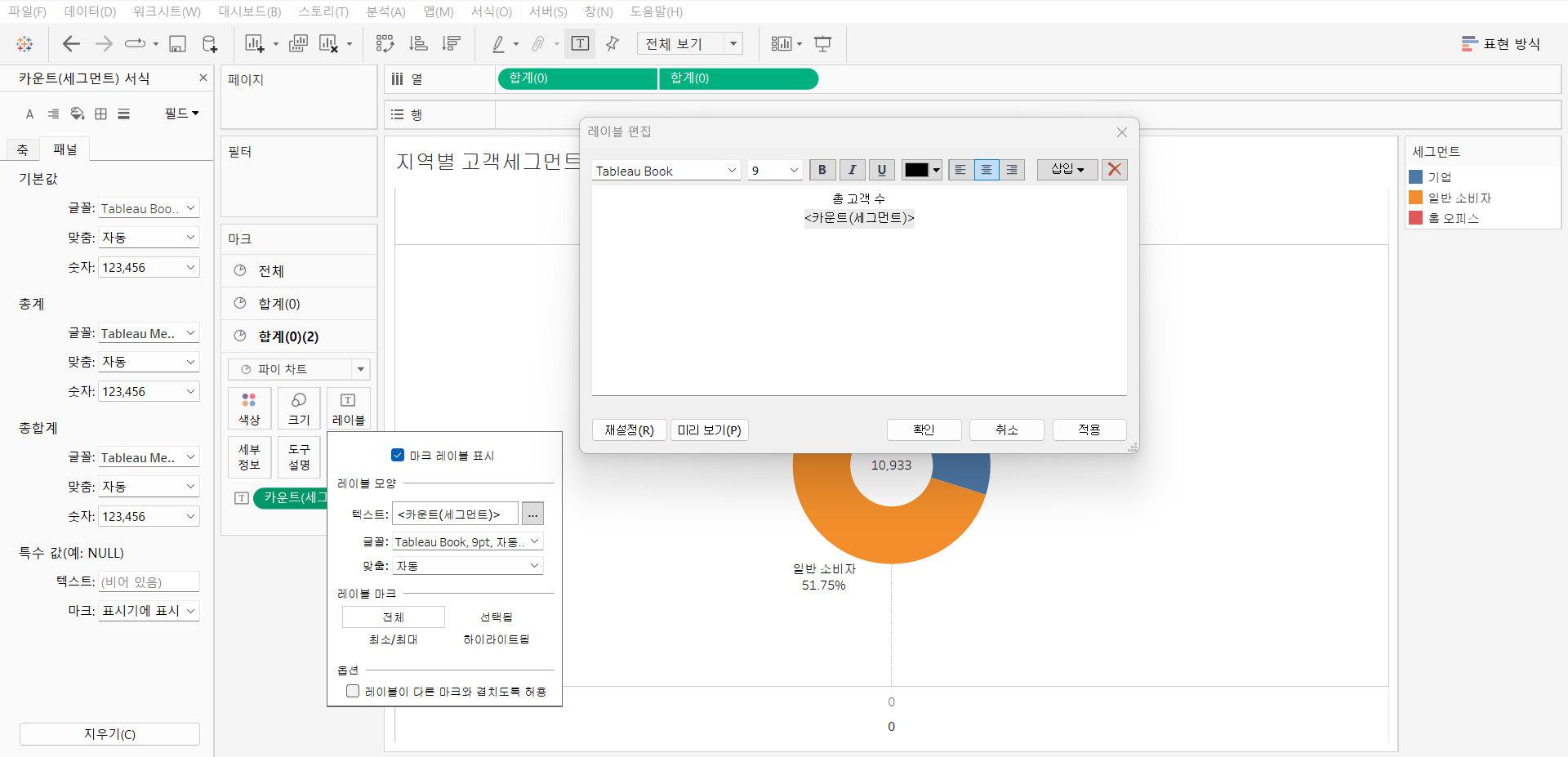 레이블은 위에는 세그먼트 이름, 밑에는 세그먼트 구성비율이 표시되도록 해 줍니다. [세그먼트 레이블 드롭다운]-[퀵 테이블 계산]-[구성비율] 을 선택해 주면 됩니다. 그리고 원의 크기를 적당히 키워 줍니다.