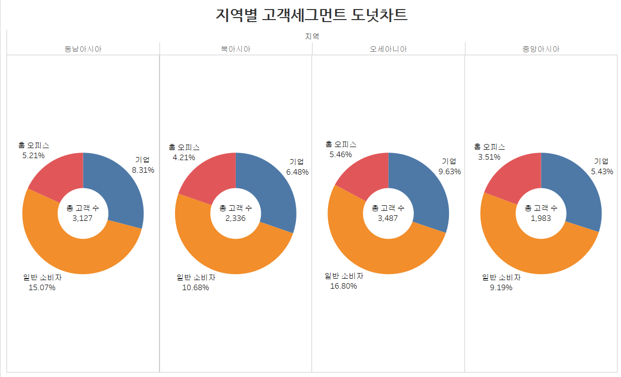 이제 원하는 도넛차트가 잘 만들어졌네요! 네 대륙의 눈에 띄는 차이가 있을까 싶었는데 거의 비슷한 비율을 가지고 있는 것을 확인할 수 있었고, 총 고객 수는 오세아니아가 가장 많고 중앙아시아가 가장 적네요.