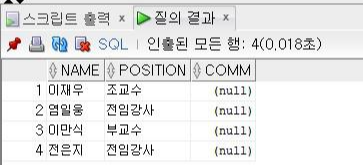 이처럼 null 연산자를 이용한 조건 검색을 할 때는 '='이 아닌 'is'을 사용해야 하는 것에 유의해야 한다. '='을 쓰면 'null' 문자열이 있는지를 검색하기 때문에 원하는 결과가 나오지 않는다.