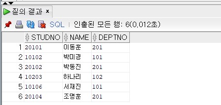 Q. IN 연산자를 이용하여 102번 학과와 201번 학과 학생의 이름, 학년, 학과 번호를 출력해라.