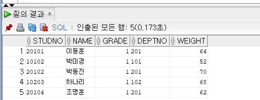 select studno,name,grade,deptno,weight from student where weight <= 70;
