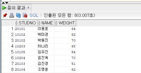몸무게가 50kg 이상 70kg 이하인 학생들의 데이터가 잘 출력되었다.