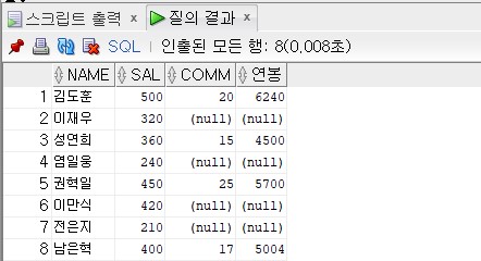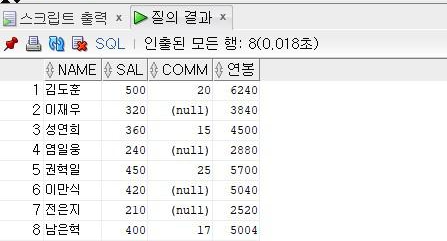 nvl은 null value이다. null이 아니면 주어진 값을 쓰고, null이면 명령문에 설정한 값을 쓰라는 의미다. 위 명령문에서는 nvl(comm,0)인데, null이 아니면 comm 값을 넣고 null이면 0을 넣고 연봉을 계산하라는 뜻이다. 예시로 이재우의 경우를 보면, comm이 null이므로 연봉은 (320+0)*12로 계산되어 3840이 출력된다.