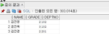 select name,grade,deptno from student where name like '_진_';